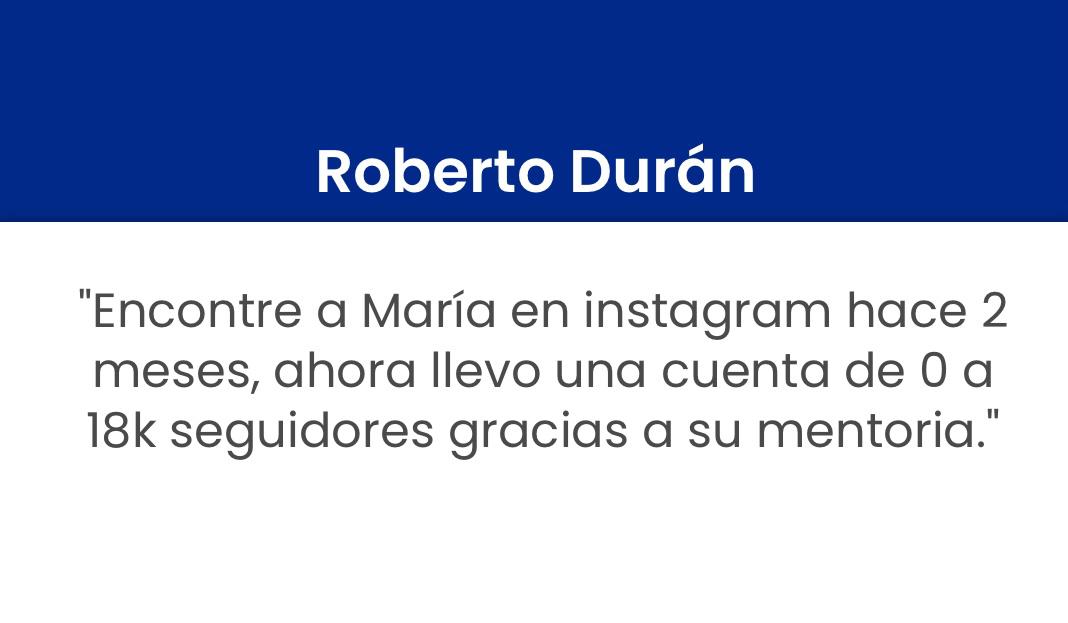Te confieso que cuando descubrí este curso también me pregunté ¿Maria, esto sí dará resultados? Y decidí probar… porque la única manera segura de no ganar nada, es no haciendo nada. Creé una cuenta de Instagram NUEVA con 0 seguidores llegué a 30k seguidores y gane durante mi proceso de formacion generando más de $2.500 dólares SIN INVERTIR NI UN DÓLAR EN ANUNCIOS.